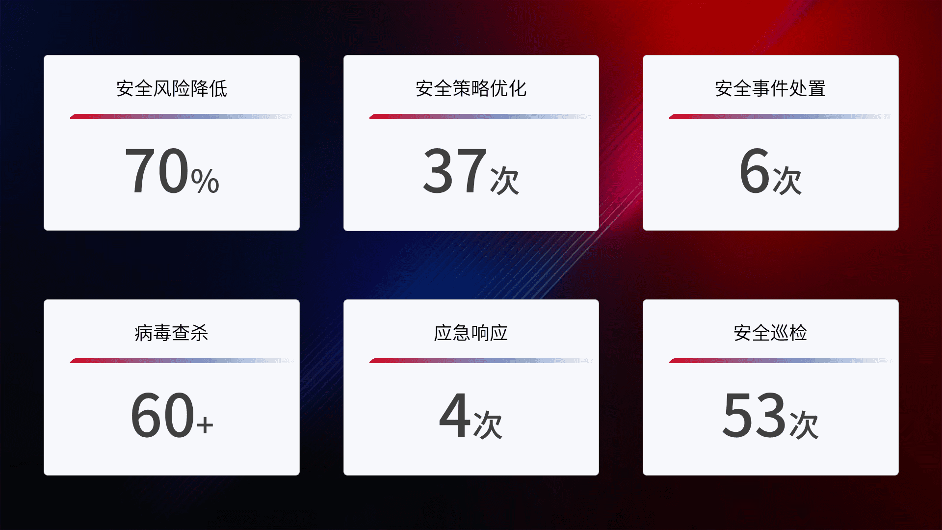 综合报告与文档服务: 定期提供安全事件处置报告、、周/季度总结报告和年度总结报告;详尽的文档服务可帮助客户了解网络安全状况,,,,支持决策制定和流程优化。。。。